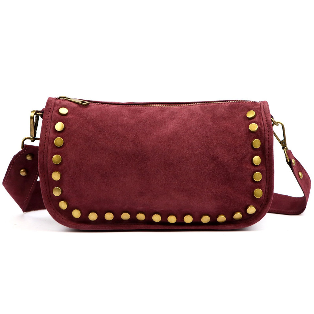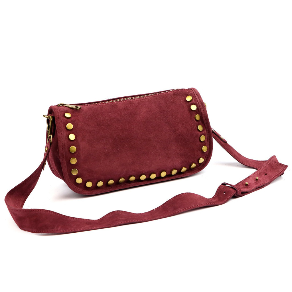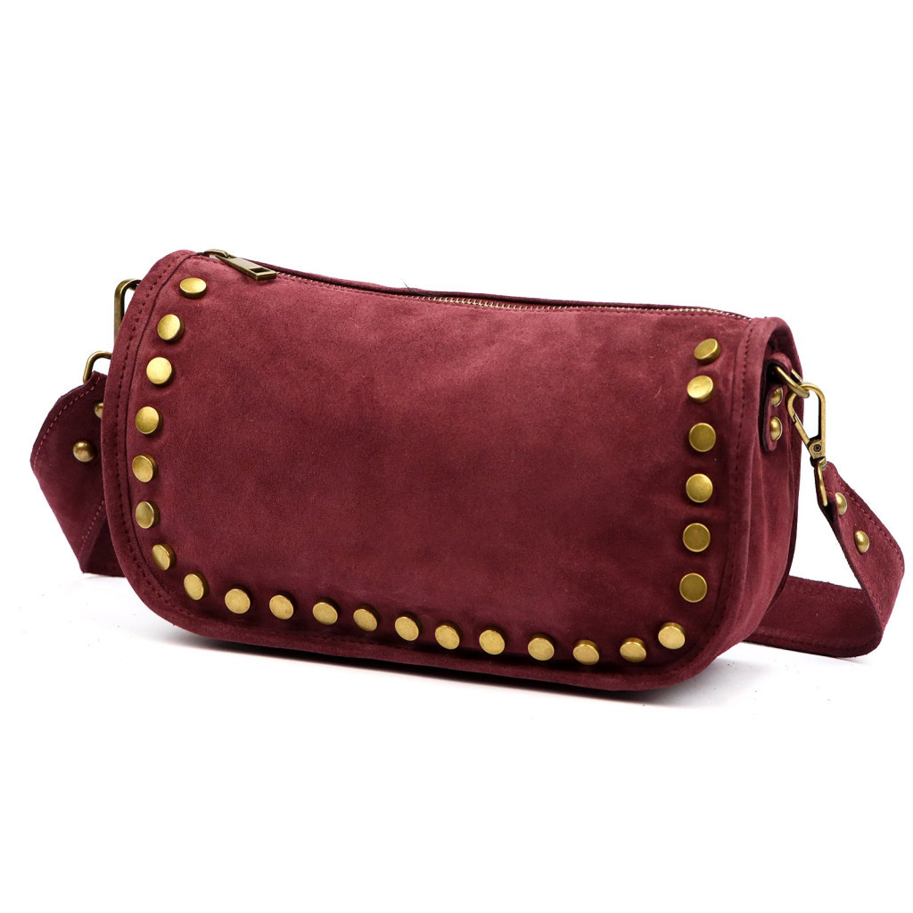 A Luka 25-087 oldaltáska elegáns, mégis vagány megjelenésű kiegészítő, amely letisztult formáját látványos fém szegecsdíszítéssel teszi különlegessé. Puha, prémium érzetű velúr bőrből készült, jellegzetes bordó árnyalatban, amely nőies, karakteres és könnyen kombinálható a hétköznapi vagy alkalmi szettekkel is.