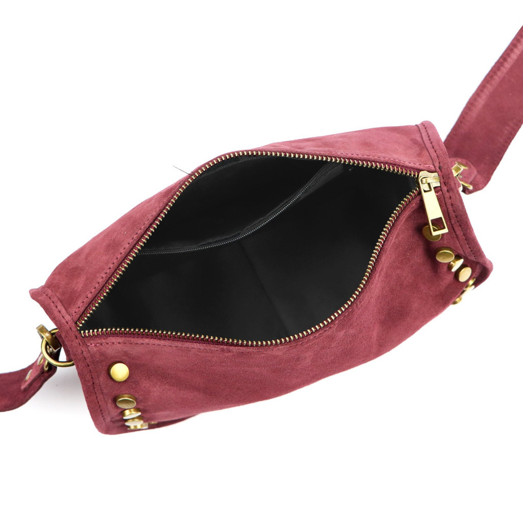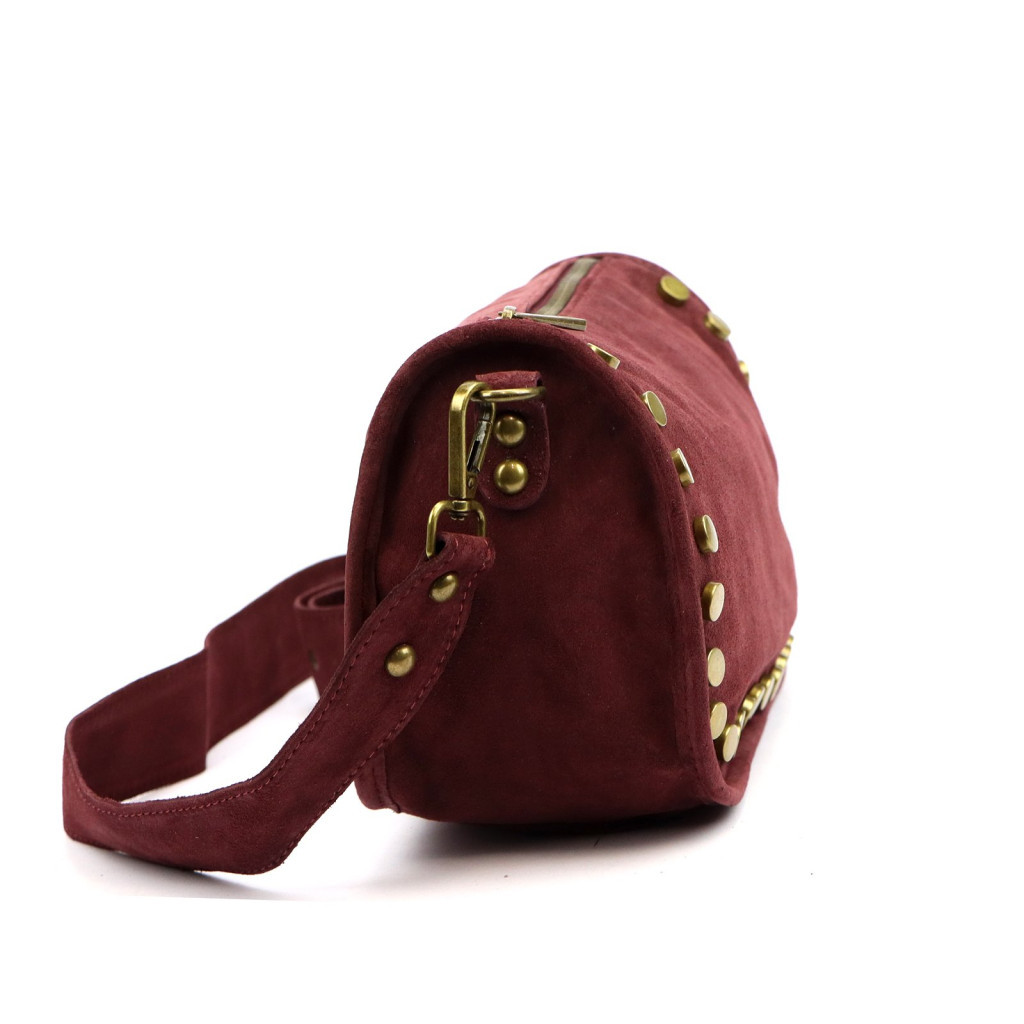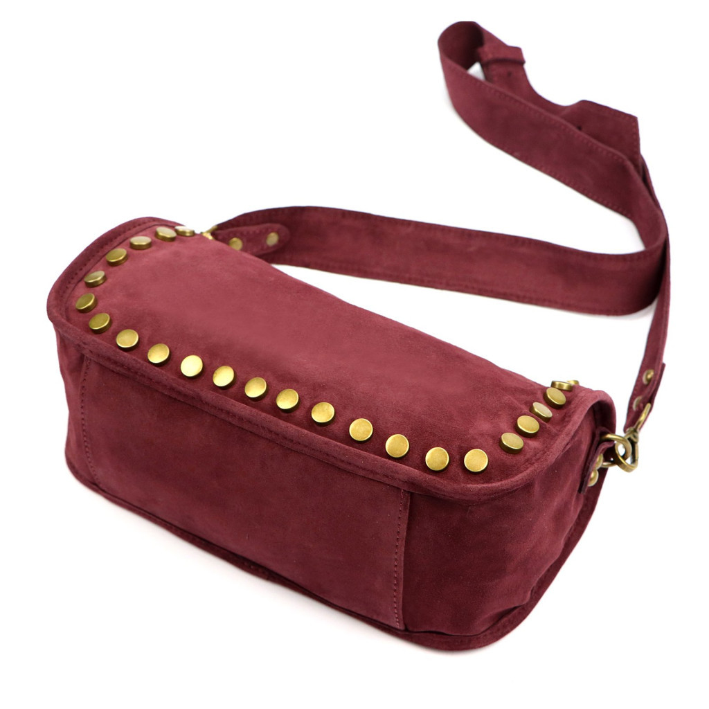 A Luka 25-087 oldaltáska elegáns, mégis vagány megjelenésű kiegészítő, amely letisztult formáját látványos fém szegecsdíszítéssel teszi különlegessé. Puha, prémium érzetű velúr bőrből készült, jellegzetes bordó árnyalatban, amely nőies, karakteres és könnyen kombinálható a hétköznapi vagy alkalmi szettekkel is.