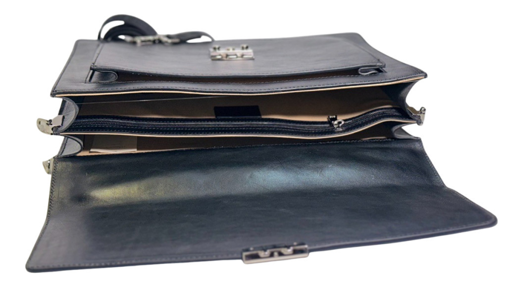 Kétrekeszes, tolltartóval és belső zsebbel. Elején nagy nyitott zsebbel, kulccsal zárható csattal.Hátoldalán egy cipzáros zseb kapott helyet.