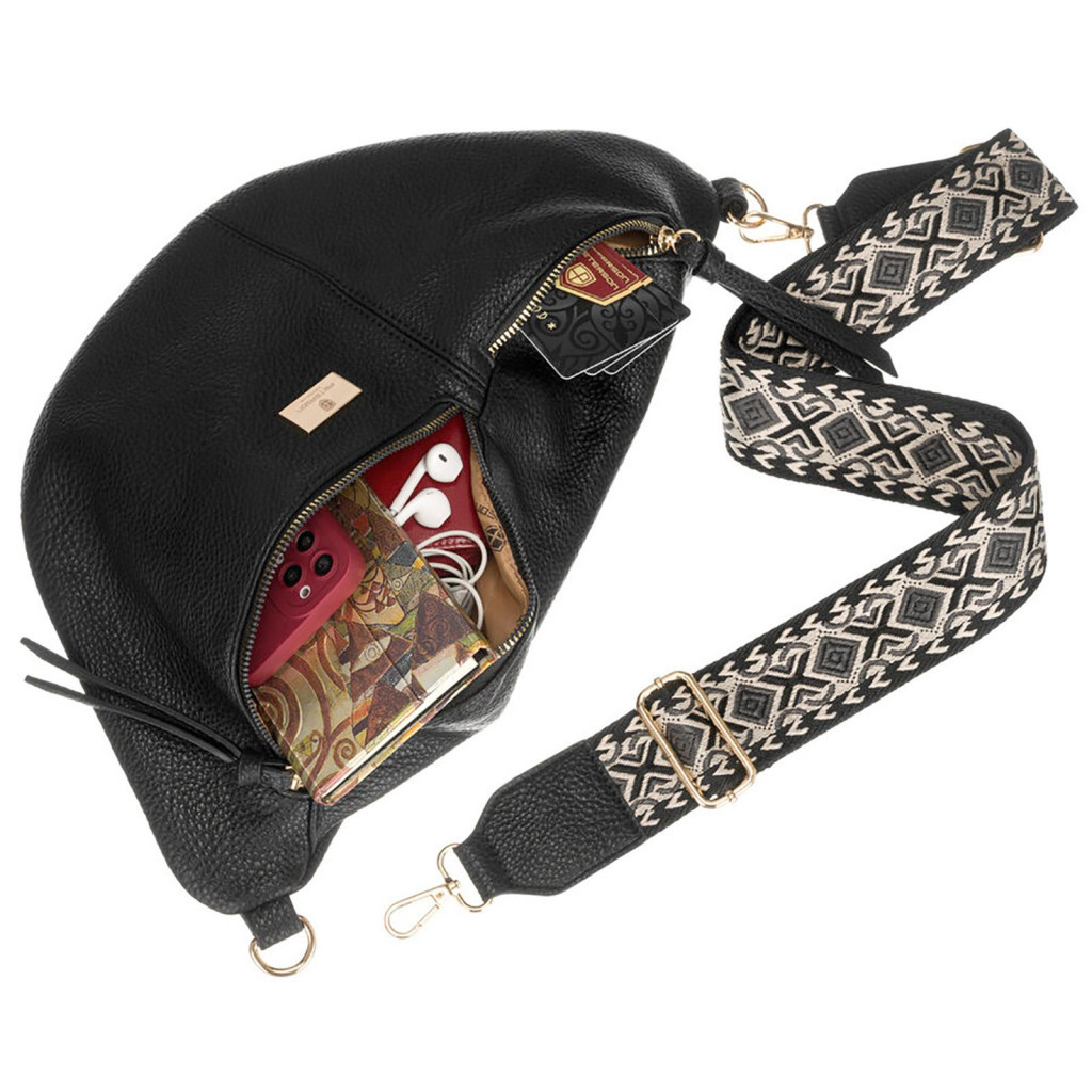 A Peterson PTN NER-ALE-2 fekete női rostbőr oldaltáska, crossbody táska egy nagyméretű, modern és stílusos kiegészítő, amely azok számára készült, akik a praktikum és az egyedi megjelenés tökéletes ötvözetét keresik. A fekete rostbőr elegáns, időtálló megjelenést biztosít, míg a táska különlegessége, a mintás, egyedi vállpánt karakteres, trendi és figyelemfelkeltő részlet, amely bármely öltözéket egyedivé tesz.