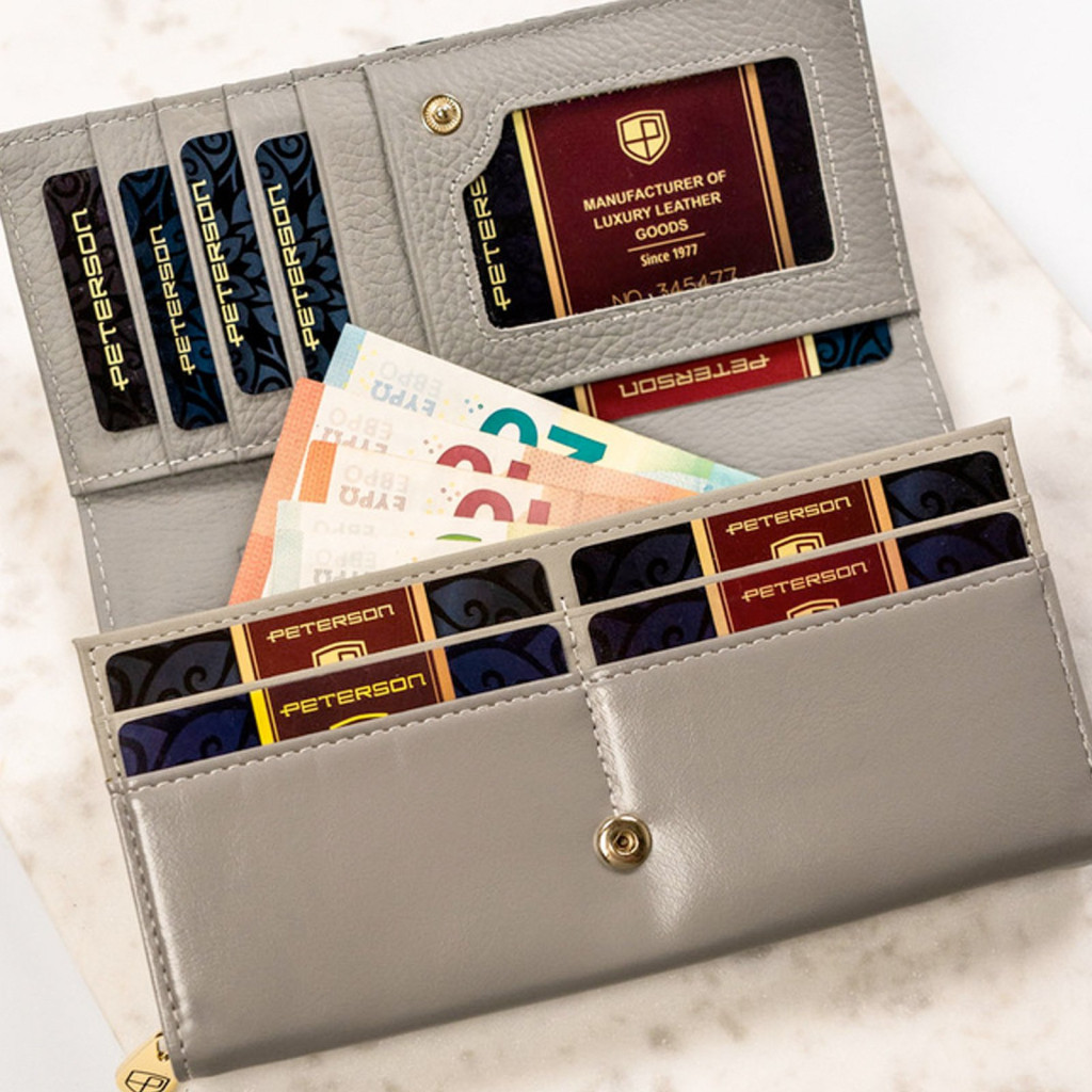 Főbb jellemzők:• Márka: Peterson – megbízható, trendkövető kiegészítők gyártója• Szín: Fekete – elegáns, klasszikus és sokoldalú• Anyag: Rostbőr – tartós, könnyen tisztítható és környezetbarátabb alternatíva• Méret: 18.5 x 9.5 x 4 cm• Rekeszek: Cipzáras aprópénztartó, 10 db kártyatartó, 1 db fénykép- és igazolványtok, 3 db papírpénztartó, 1 db rejtett cipzáras zseb• Záródás: Patentes