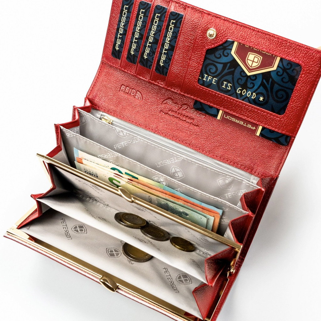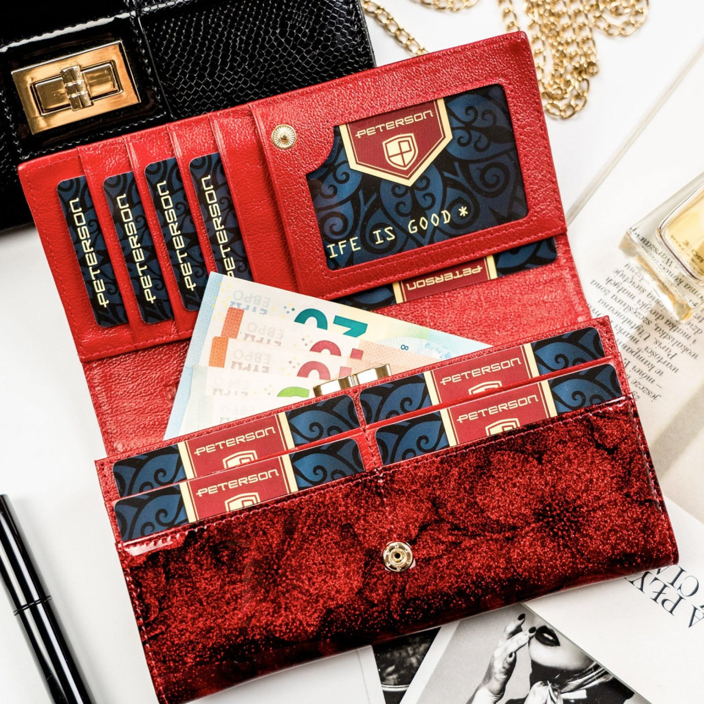 Peterson PTN PS401-FDS piros női pénztárca – Elegáns fényes felület, virágos részletek