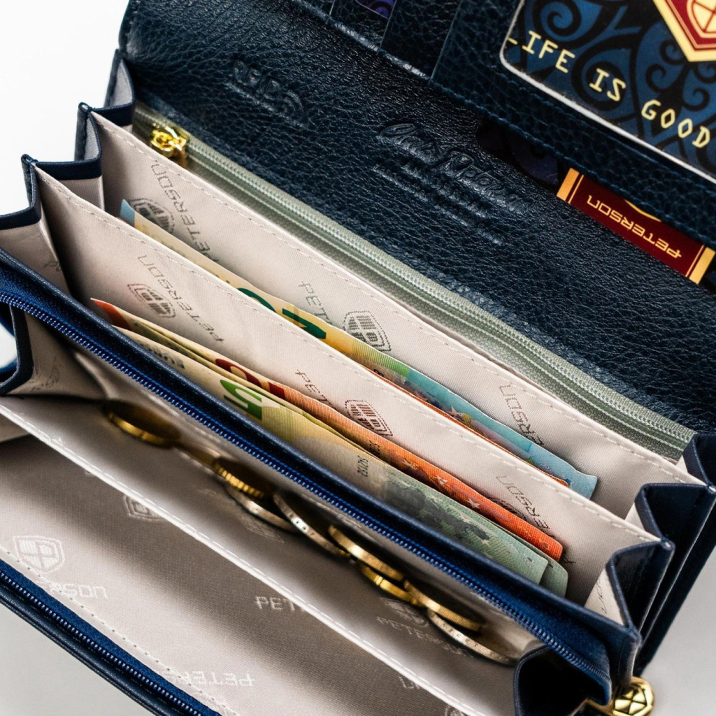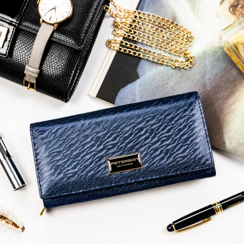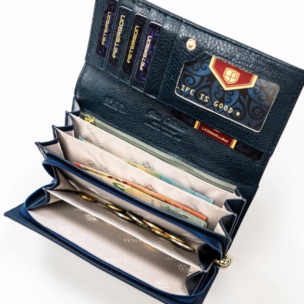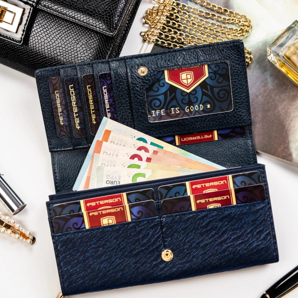 A Peterson PTN PX20-CNF sötétkék női pénztárca 18,5 x 9 x 3,5 cm ideális választás azoknak a nőknek, akik egy tágas, elegáns és jól rendszerezhető pénztárcát keresnek a mindennapokra.