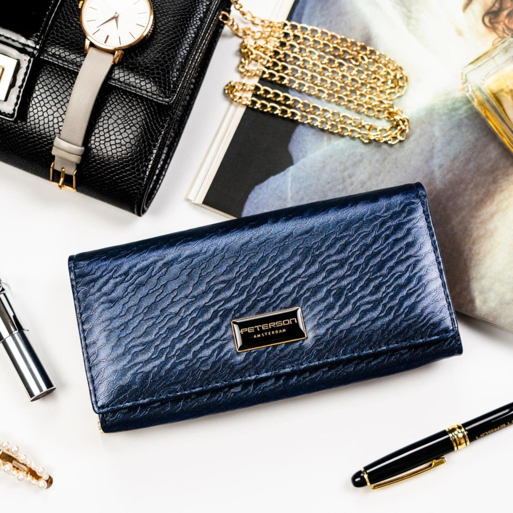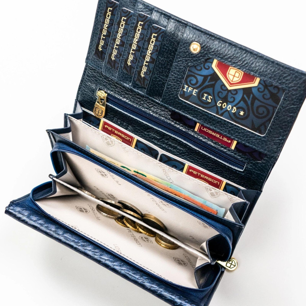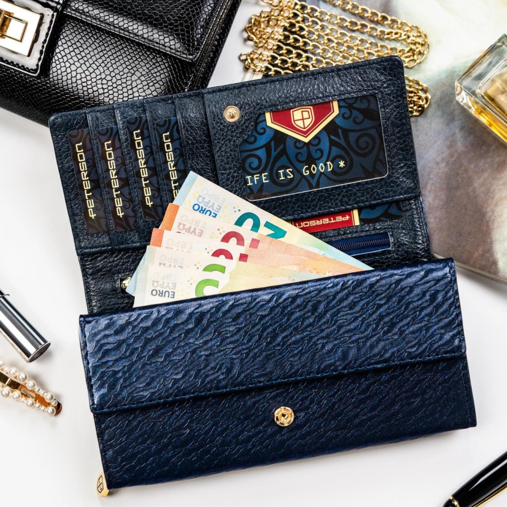 A Peterson PTN PX28-CNF sötétkék női pénztárca 18,5 x 9 x 3,5 cm ideális választás azoknak a nőknek, akik egy elegáns, jól rendszerezhető és praktikus pénztárcát keresnek kifinomult megjelenéssel.