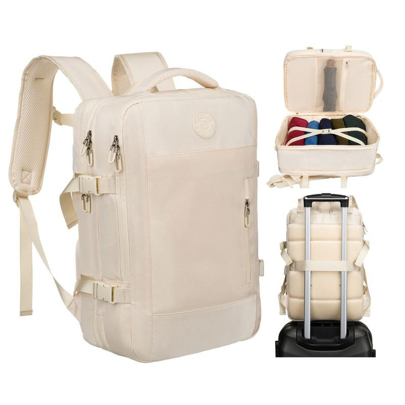 Az elülső felső zseb vízálló bevonattal rendelkezik a higiéniai és nedvességnek kitett tárgyak számára, alatta pedig egy második, függőlegesen cipzáras zseb található a gyors hozzáféréshez. Az integrált USB-port lehetővé teszi az eszközök töltését a hátizsák kinyitása nélkül. A 3D hálós pántok és hátrész légáramlást biztosítanak, a felső fogantyúk, mellkaspántok és bőröndhöz rögzíthető pánt tovább növeli a komfortot, míg az oldalsó kompressziós pántok stabilan tartják a tartalmat.