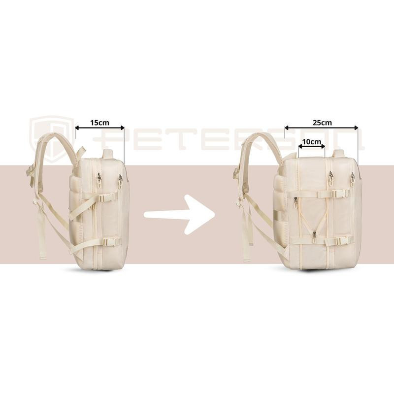 Praktikus és elegáns bézs utazóhátizsák laptophellyel és USB-porttal a Peterson márkától. Háromoldalú belső szerkezete és átgondolt rekeszelése biztosítja a tökéletes szervezettséget, miközben a hátizsák mélysége igény szerint 15-ről 25 cm-re növelhető. A hátsó stabilizáló pántok és hálós válaszfalak segítik a kényelmes és biztonságos utazást.