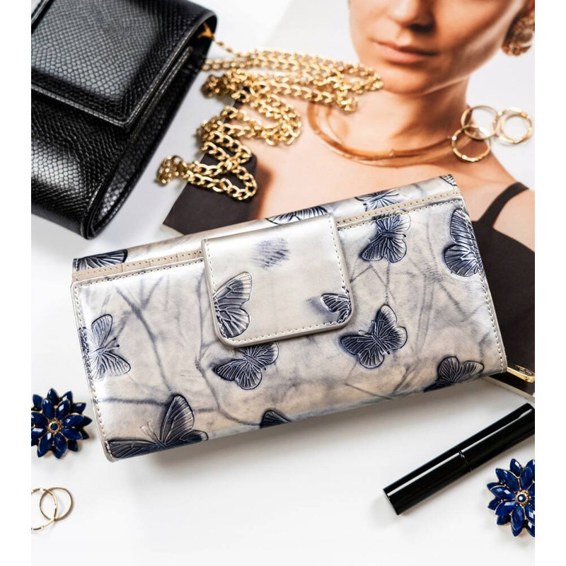 Klasszikus szabás eredeti részletekkel Klasszikus stílusú pénztárca gyönyörű pillangó mintával. A modell vízszintes fekvésű, biztonságos és strapabíró retesszel van rögzítve, és a pénztárca elején arany márka logó is található;