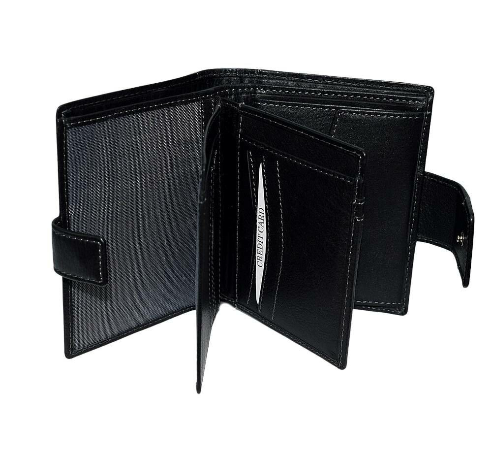 Két papírpénztartó rekesze, illetve 9 kártyatartója és 2 hálós irattartója van. Aprópénztartója patenttal zárható. Belső felében 8 nyitott és 1 cipzárral zárható zsebet is találunk, mely kisebb értékeink tárolására is alkalmas. A pénztárca hátulsó felében egy szintén kisebb, nyitott zsebet találunk.