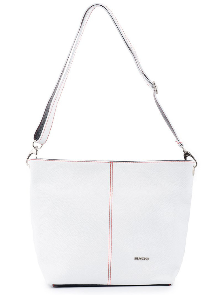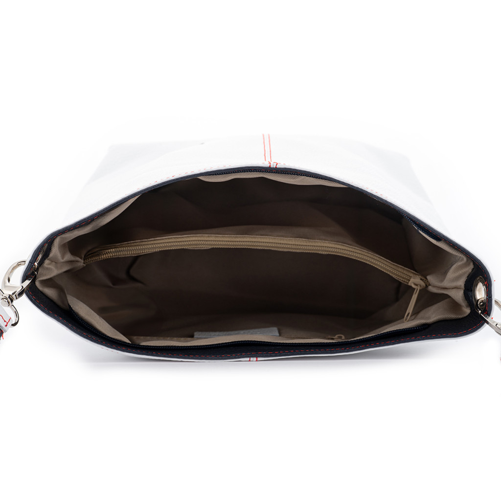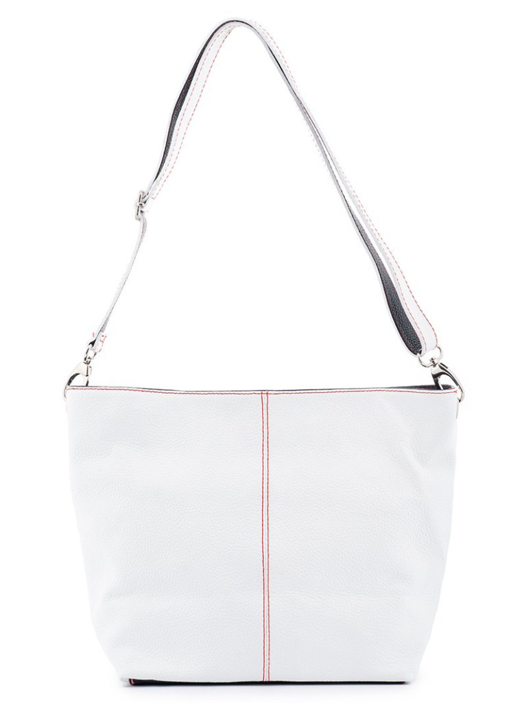• Méret: 23 × 25 × 13 cm• Alapanyag: Valódi bőr• Fehér alapszín fekete bőrbetétekkel• Piros díszvarrás az egyedi megjelenésért• Egyrekeszes kialakítás válaszfallal• Válaszfalban cipzáras zseb a rendszerezéshez• Belső cipzáras mobiltartó zseb a telefon védelmére• Levehető és állítható bőr vállpánt fekete bőr belső résszel• Stílusos és egyedi megjelenés