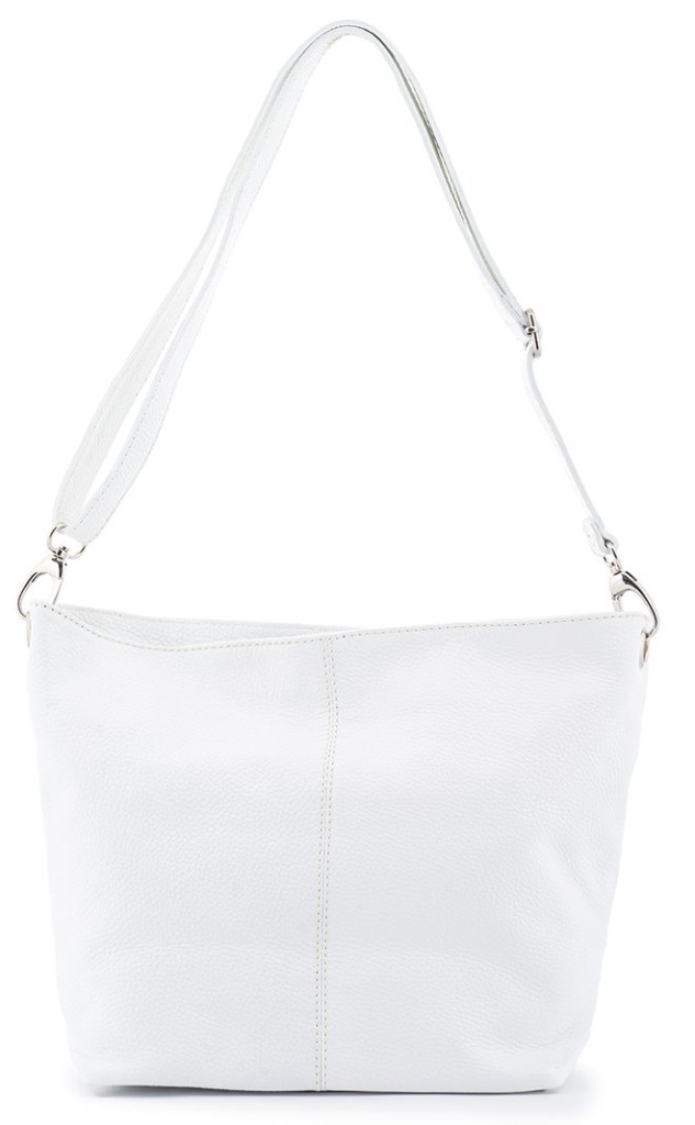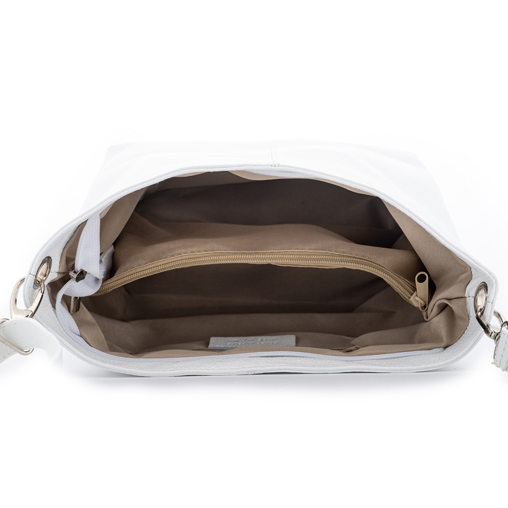 • Méret: 23 × 25 × 13 cm• Alapanyag: Valódi bőr• Egyrekeszes kialakítás válaszfallal• Válaszfalban cipzáras zseb a rendszerezéshez• Belső cipzáras mobiltartó zseb a telefon védelmére• Levehető és állítható bőr vállpánt a sokoldalú viselethez• Elegáns fehér szín, klasszikus design
