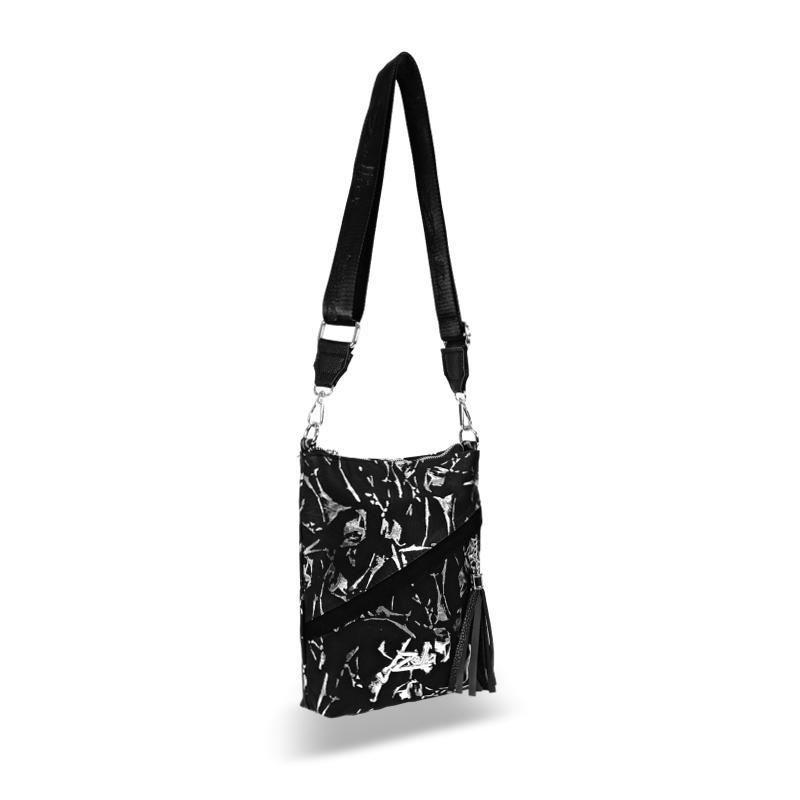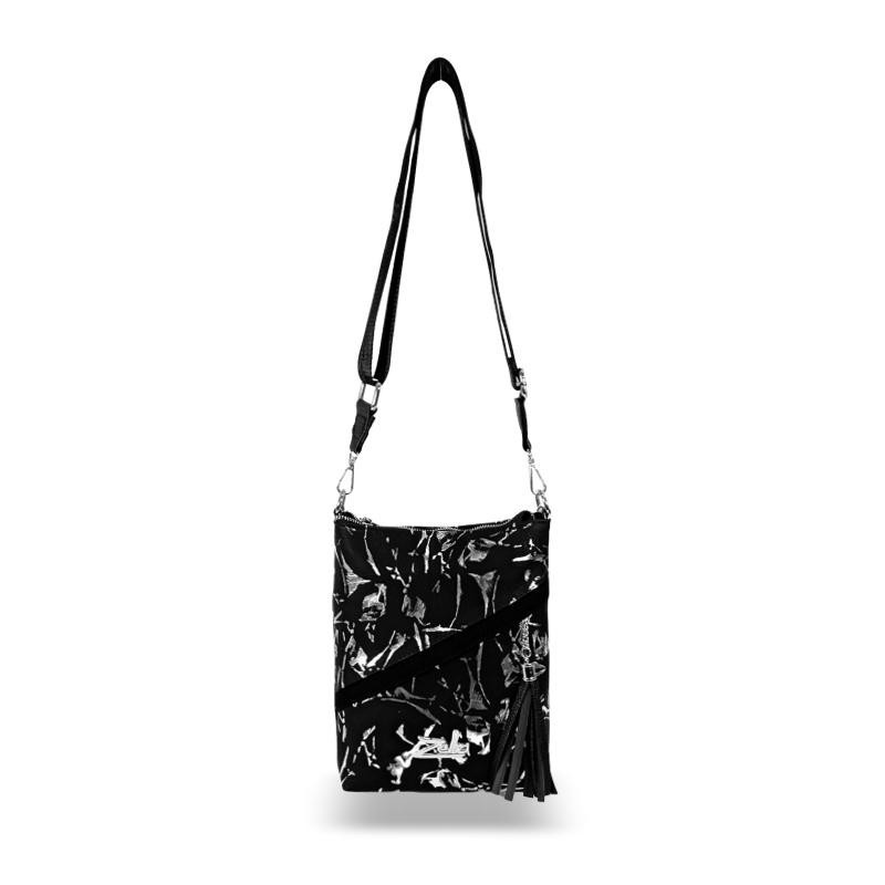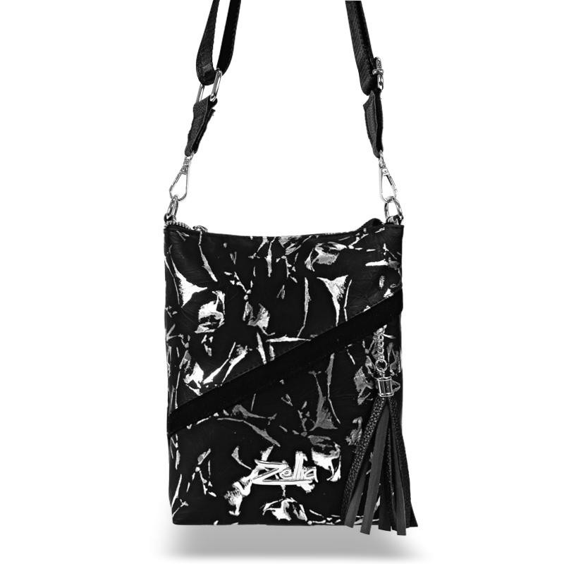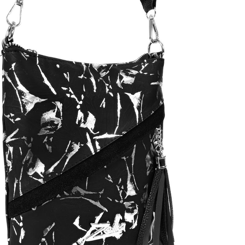 A Zellia 23012 fekete–ezüst márvány mintás változata modern és karakteres megjelenést kínál. A táska teljes felülete matt fekete–ezüst márvány mintás rostbőr borítású, amely egyedi, texturált és dinamikus hatású megjelenést biztosít. A márványszerű mintázat elegáns, mégis feltűnő, így a modell különleges kiegészítője lehet hétköznapi és alkalmi összeállításoknak is. Az elülső cipzáras keresztzseb bőr díszbojttal tovább erősíti a nőies, dekoratív megjelenést.