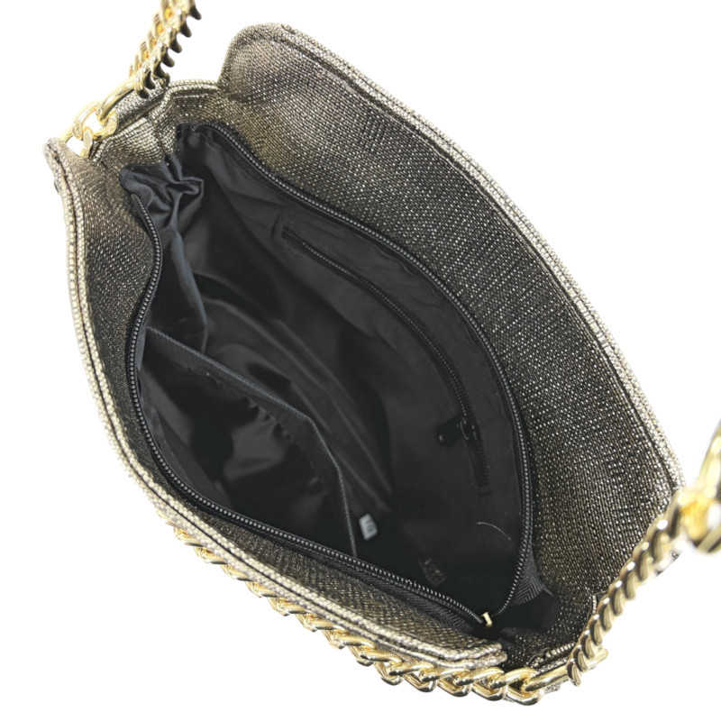A táska aranyozott láncdísszel és elegáns fémkiegészítőkkel készült, amelyek tovább fokozzák a luxus hatást. A vállpánt láncból indul, majd a kényelmes viselet érdekében puha, texturált anyagban végződik. A modellhez válltáska pánt és oldaltáska pánt is tartozik, így a táska tetszés szerint többféleképpen hordható – kézben, vállon vagy keresztben.