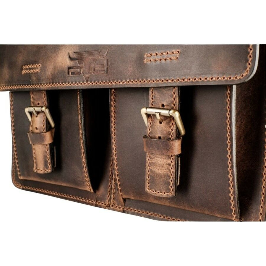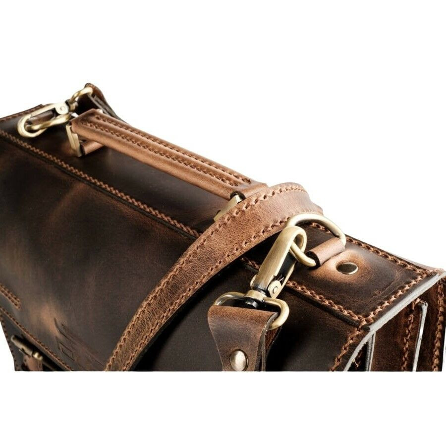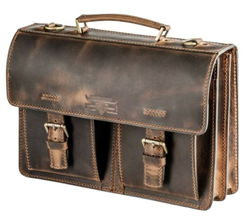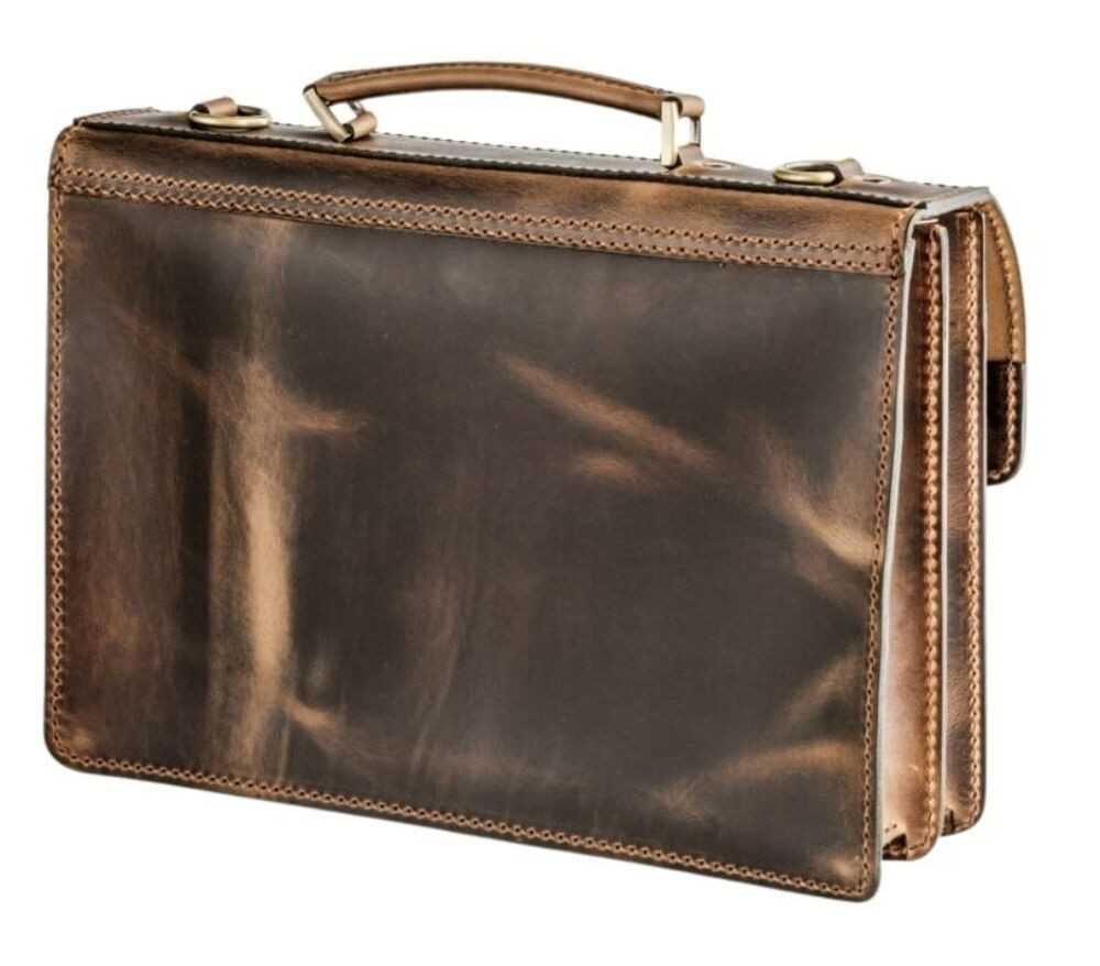 Pull-up koptatott hatású sportos jellegű marhabőr aktatáska, két nagy rekesszel, melyben bevarrt mobil- és névjegytartó található. Elől két zsebbel van ellátva, szabályozható hosszúságú bőr vállpánttal.