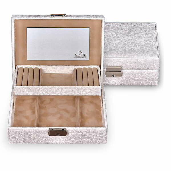 A kiváló minőségéről ismert 160 éves német Sacher cég által, manufaktúrában, teljes egészében kézi munkával készített ékszerdoboz.