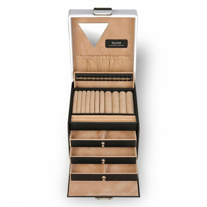 A kiváló minőségéről ismert 150 éves német Sacher cég által, manufaktúrában, kézi munkával készített ékszerdoboz.