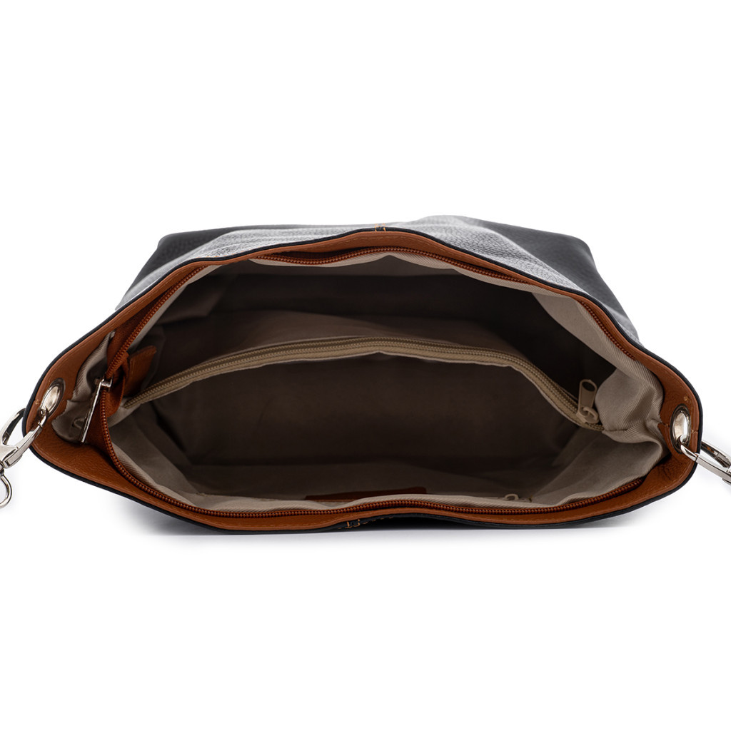 A táska egyetlen, jól szervezett rekeszből áll, amely egy középső válaszfallal van elválasztva, így könnyedén rendszerezhető benne a napi szükségletek. A válaszfalban található egy cipzáras zseb, amely biztonságos tárolást kínál kisebb értéktárgyaknak. A belső térben egy további cipzáras mobiltartó zseb is helyet kapott, amely segít a telefon védett és könnyen elérhető tárolásában.
